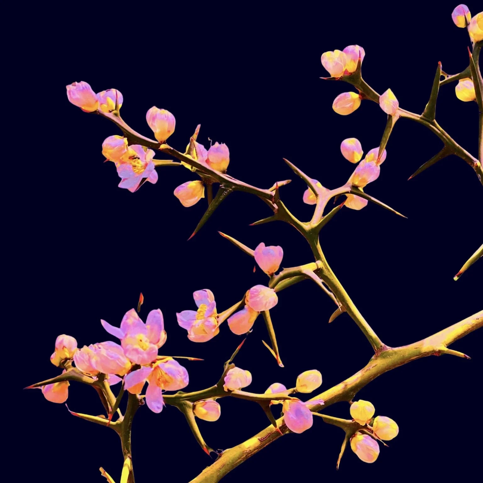 Part documentation, part transformation, the resulting imagery within the TRANSFOLIATE SERIES attempts to reach beyond a mere documentation of an invasive species in bloom. These flowers and thorns are now transformed into an homage to the wild, impermanent beauty of nature itself. A reflection of the diversity embedded within the natural world, as a counter to the cultural myths and societal illusions that we human beings project onto ourselves. In this way, the series becomes a meditation on change, resilience, and the quiet drama of life unfolding at the edge of perception